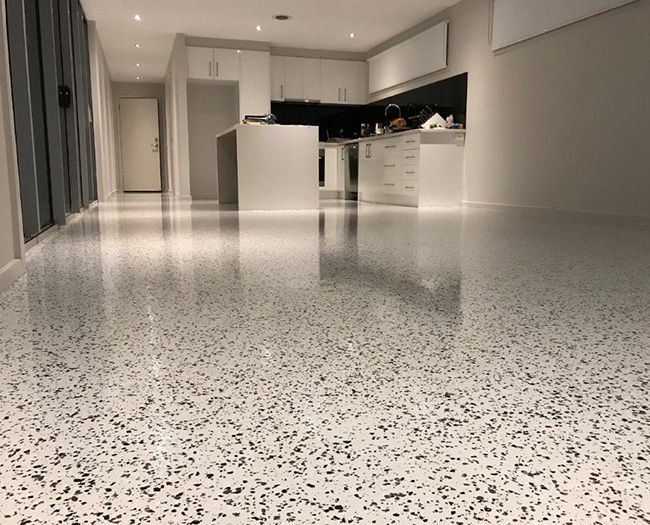 Epoxy floors are easy to maintain. Just sweep and mop regularly with a pH-neutral cleaner. Don't use harsh chemicals or abrasive pads to preserve its glossy finish.